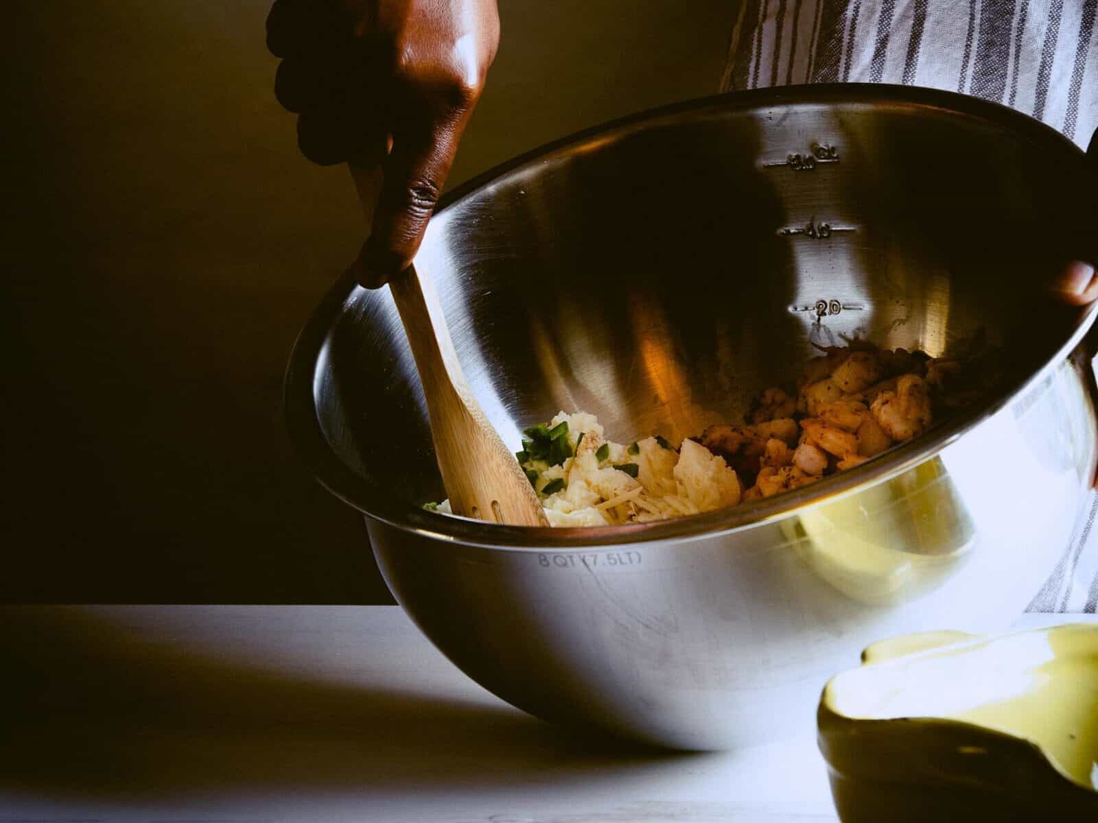 - Fold chopped shrimp into the mixture.