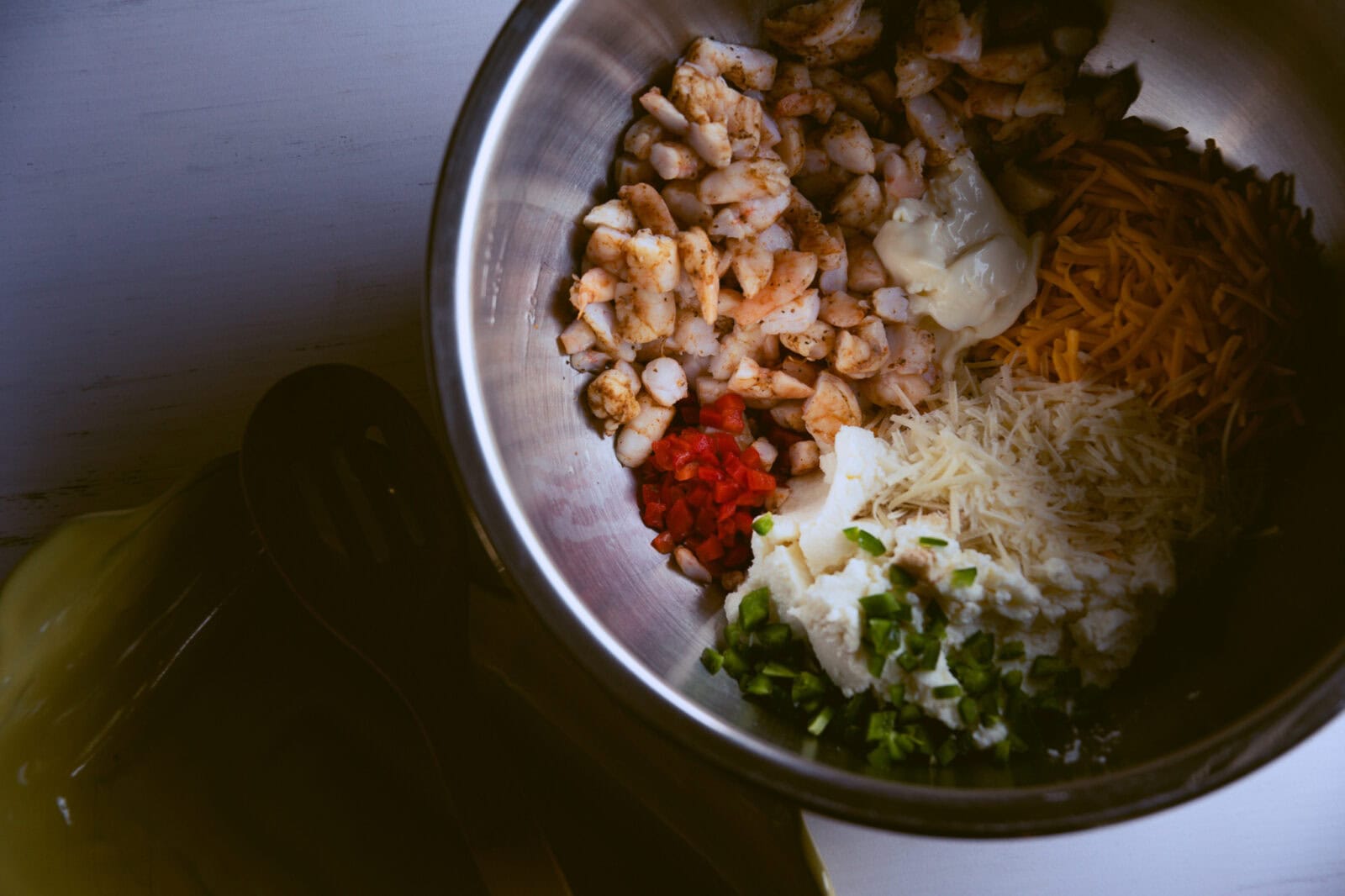 - In a bowl mix ricotta, mayo, jalapeño, cheddar, Parmesan, pimentos, Worcestershire, salt, and pepper.